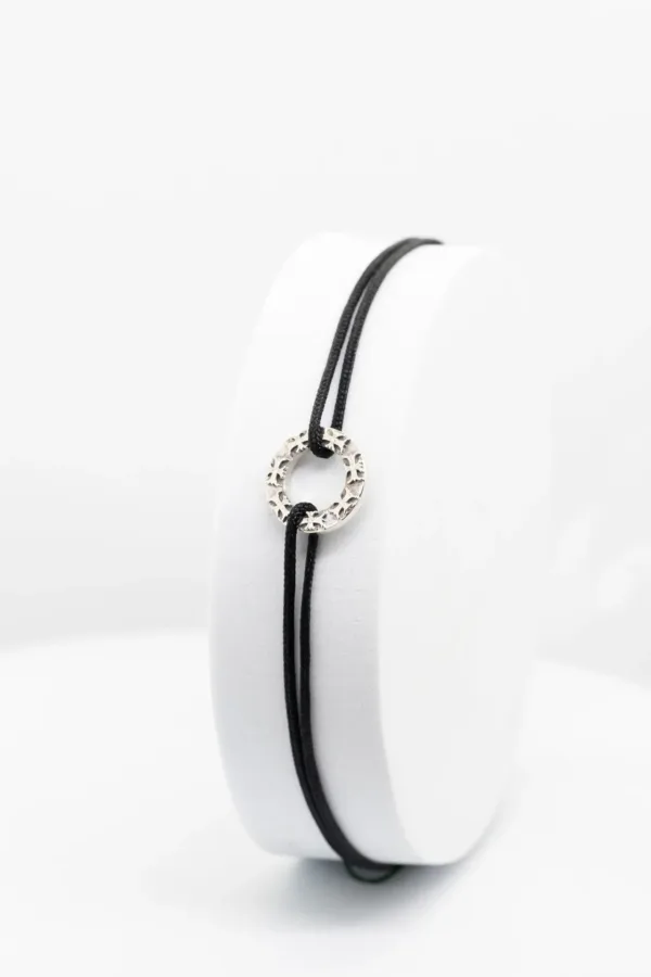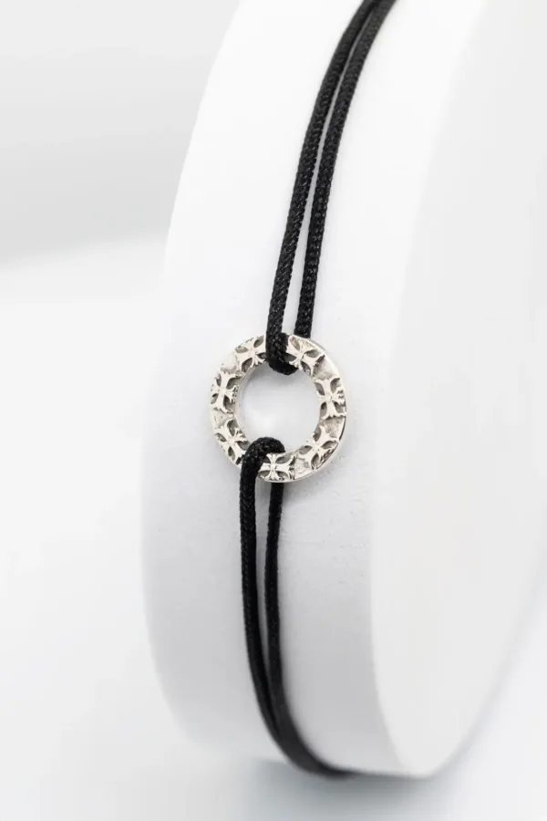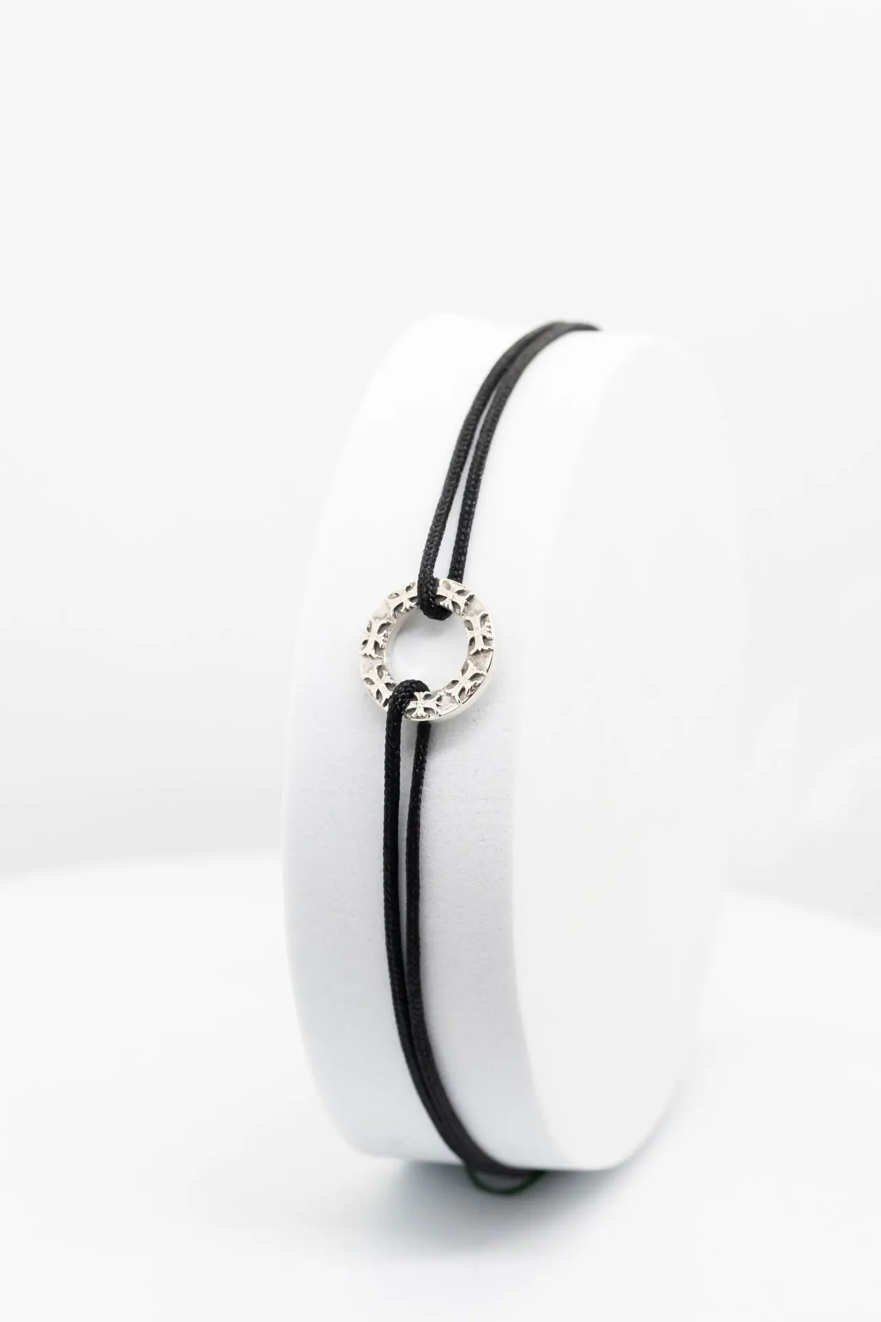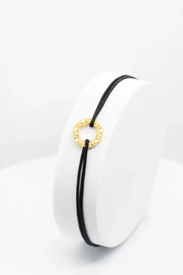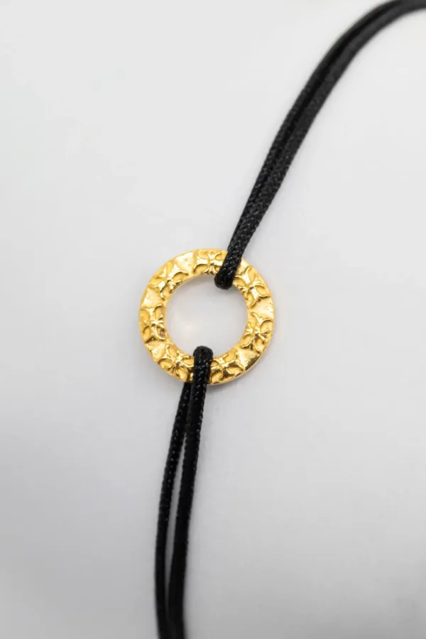 A Pulseira NOA é a junção de artesanato e minimalismo. Em prata 925 com banho de ouro 24K, apresenta um pendente circular com padrão em relevo que acrescenta textura e sofisticação. O fio preto ajustável garante conforto e um encaixe perfeito, resultando numa peça versátil e intemporal para o dia a dia ou ocasiões especiais.