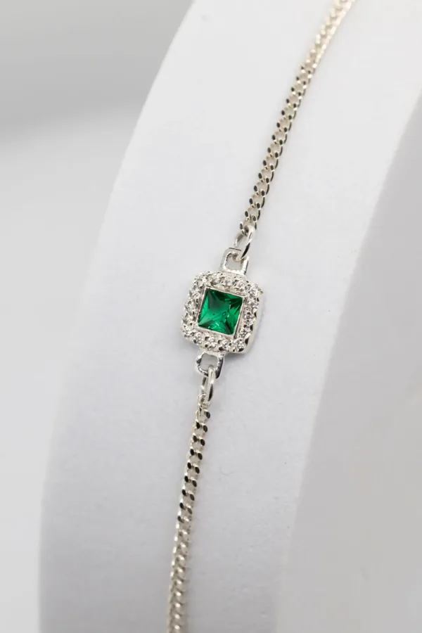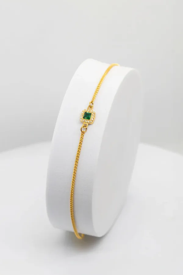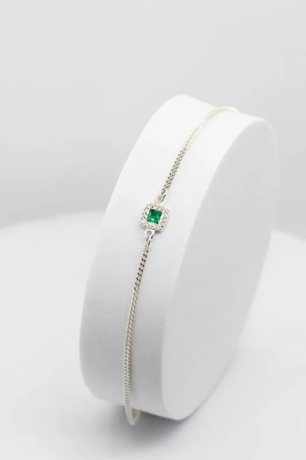 A Pulseira Simone é uma peça que alia minimalismo e sofisticação. Produzida em prata 925 e com banho de ouro 24K, apresenta uma corrente de elo fino e elegante. O destaque vai para a zircónia verde em corte quadrado, cuidadosamente cravada, rodeada por pequenas zircónias cristal que reforçam o brilho e acrescentam requinte. Uma pulseira versátil e intemporal, pensada para o homem que aprecia estilo com discrição e presença.