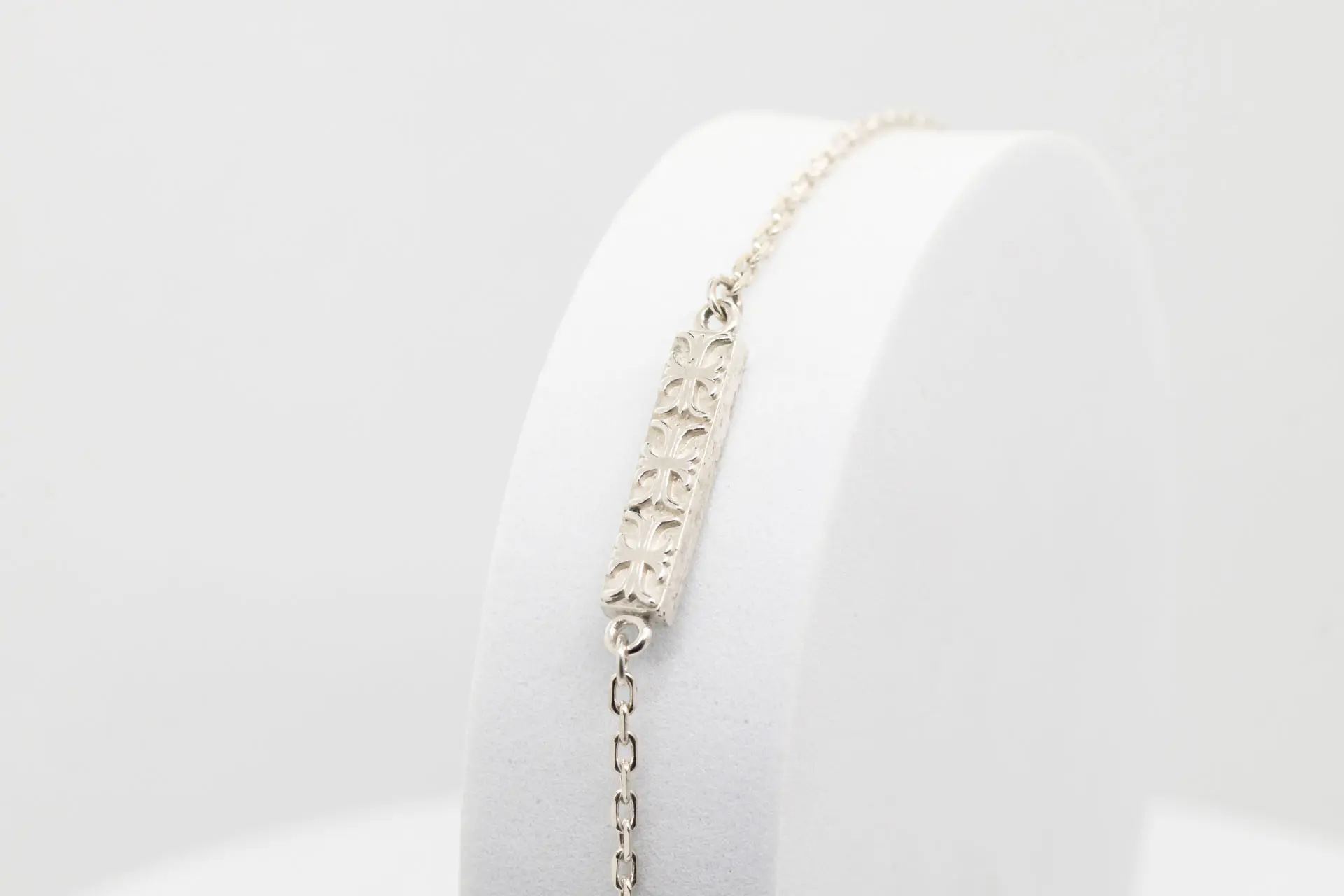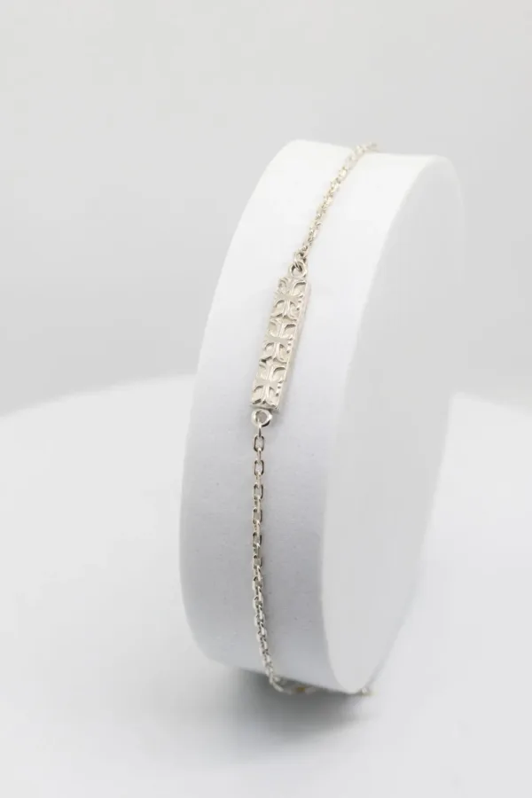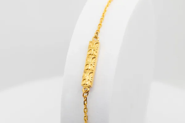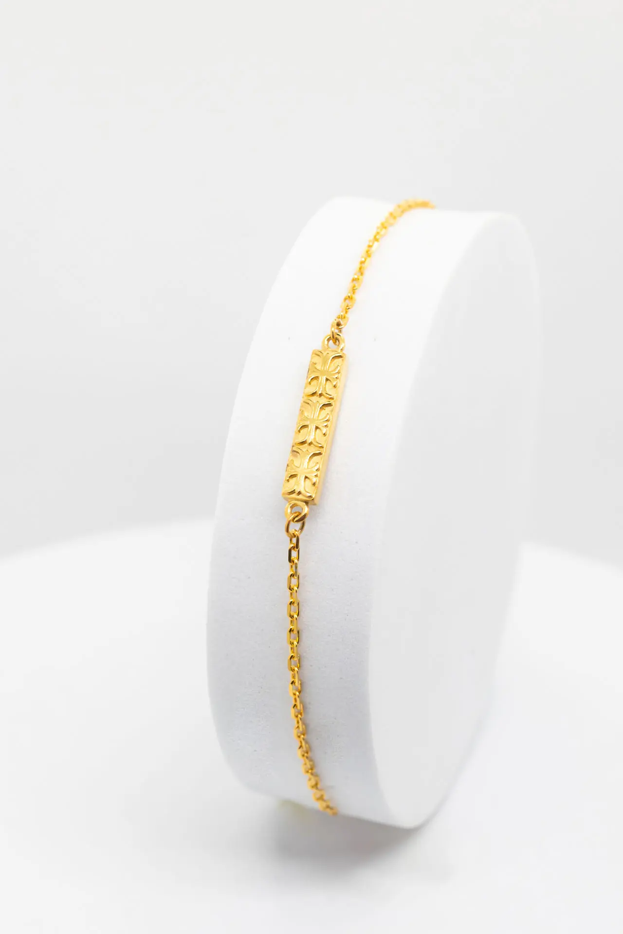 A Pulseira NOA Placa é uma peça masculina de linhas minimalistas e sofisticadas, produzida em prata 925 com banho de ouro 24K. A corrente de elos finos e resistentes garante conforto no uso diário, enquanto o centro retangular, trabalhado em relevo com padrão geométrico, acrescenta detalhe e carácter. Um acessório distinto e versátil, pensado para o homem que aprecia elegância discreta e atenção ao pormenor.