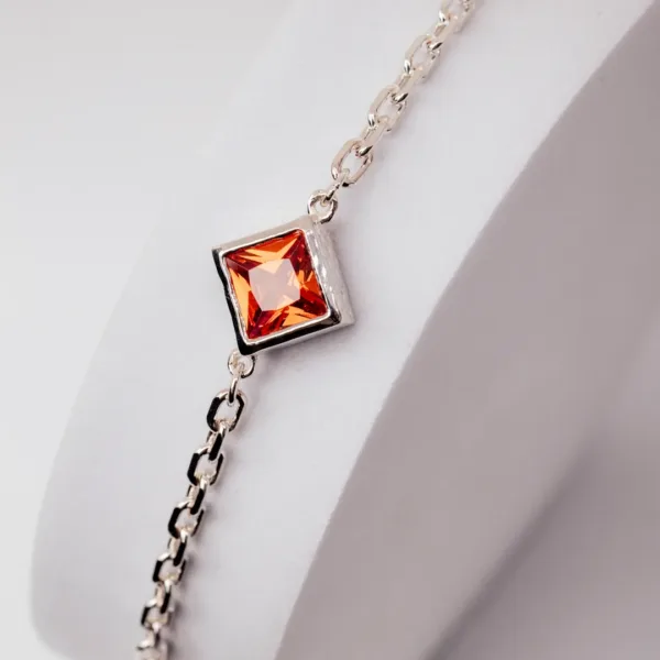 A pulseira Núbia água marinha conta com uma pedra zircónia cravada numa caixa quadrada de prata 925 banhada a ouro com detalhes únicos a toda a volta da mesma. O banho pode ser em ouro amarelo ou ouro branco. A malha é um cadeado lapidado que dá um toque elegante e robusto á pulseira, por isso, junto com o brilho da zircónia, torna esta peça muito especial e fácil de conjugar com todo o tipo de indumentária.